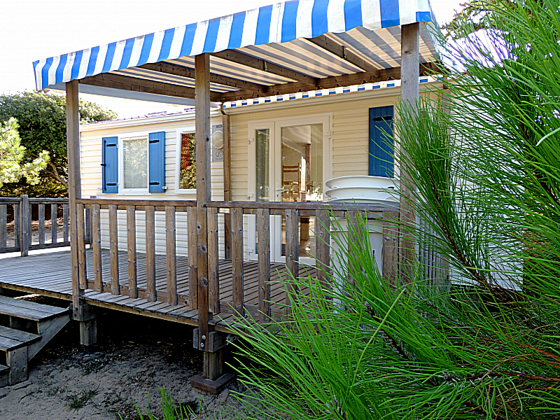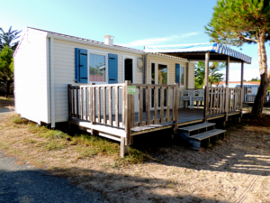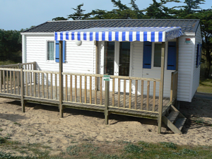 – mobil home de 27 m² avec terrasse en bois semi-couverte ou semi-fermée suivant le model (salon de jardin pour 6 personnes)