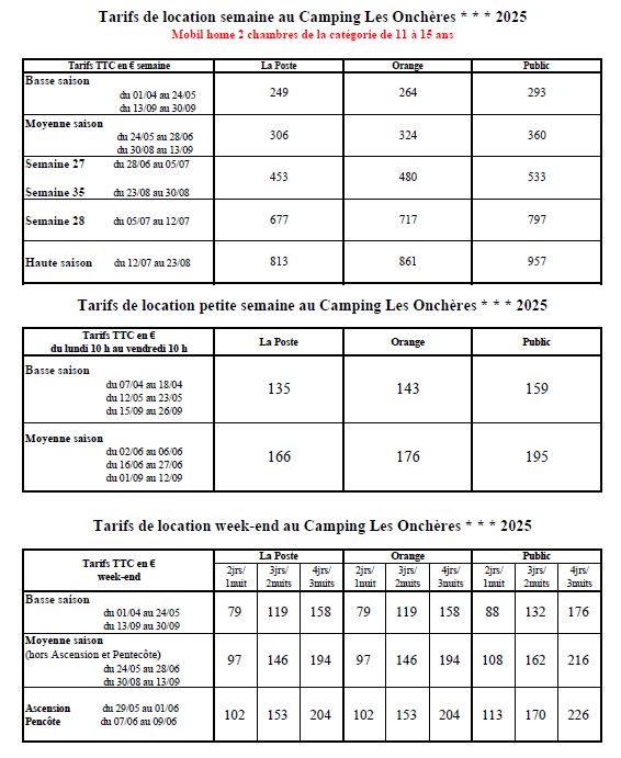 Dans un cadre agréable de 10 hectares, le Camping «Les Onchères», vous accueille du 1er Avril au 30 Septembre, avec son accès direct à la plage, sa piscine (pataugeoire, toboggan, bassin à contre-courant et grand bassin) ouverte et chauffée en moyenne et haute saison, mais aussi ses aires de jeux pour enfants, accès handicapé.