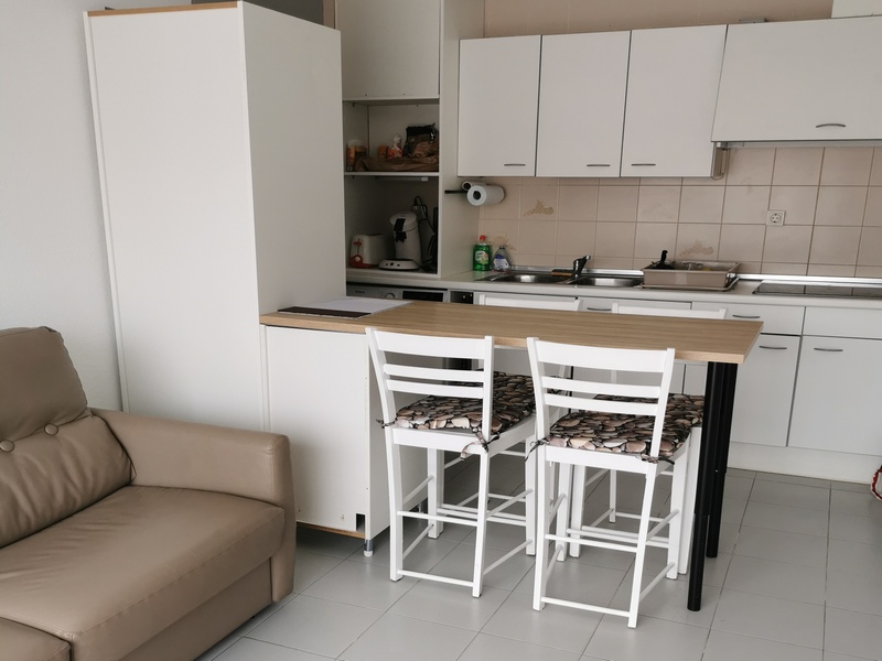 – 1 pièce principale avec sortie sur terrasse, composée d’un séjour /cuisine équipée (plaque électrique, micro-onde, réfrigérateur, lave-linge, cafetière électrique, grille-pain, aspirateur ) , 1 table plan de travail et 4 chaises , 1 canapé convertible 2 places 140( matelas couchage quotidien ) , T.V.